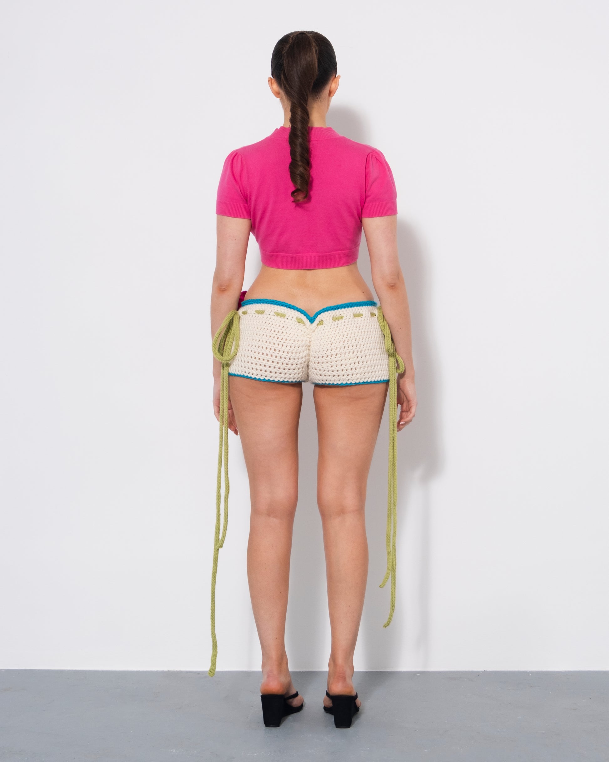Handmade crochet booty shorts with ruch detailing on the bum