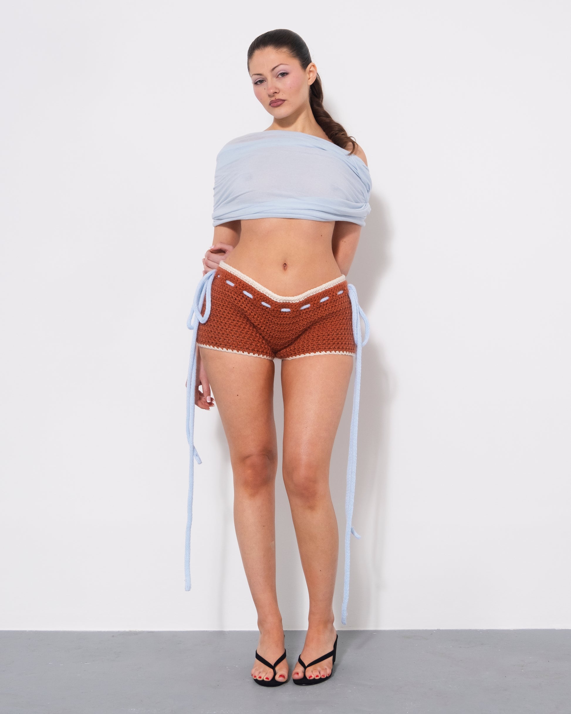 Made from burnt orange 100% wool and kid silk mohair, ice blue bows act as drawstring around the waist
