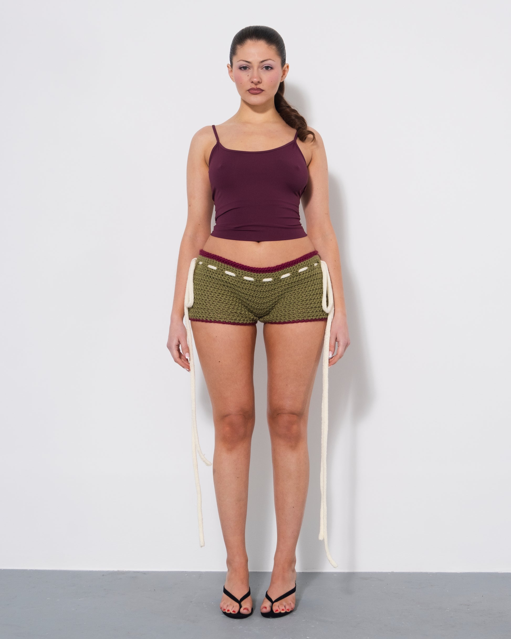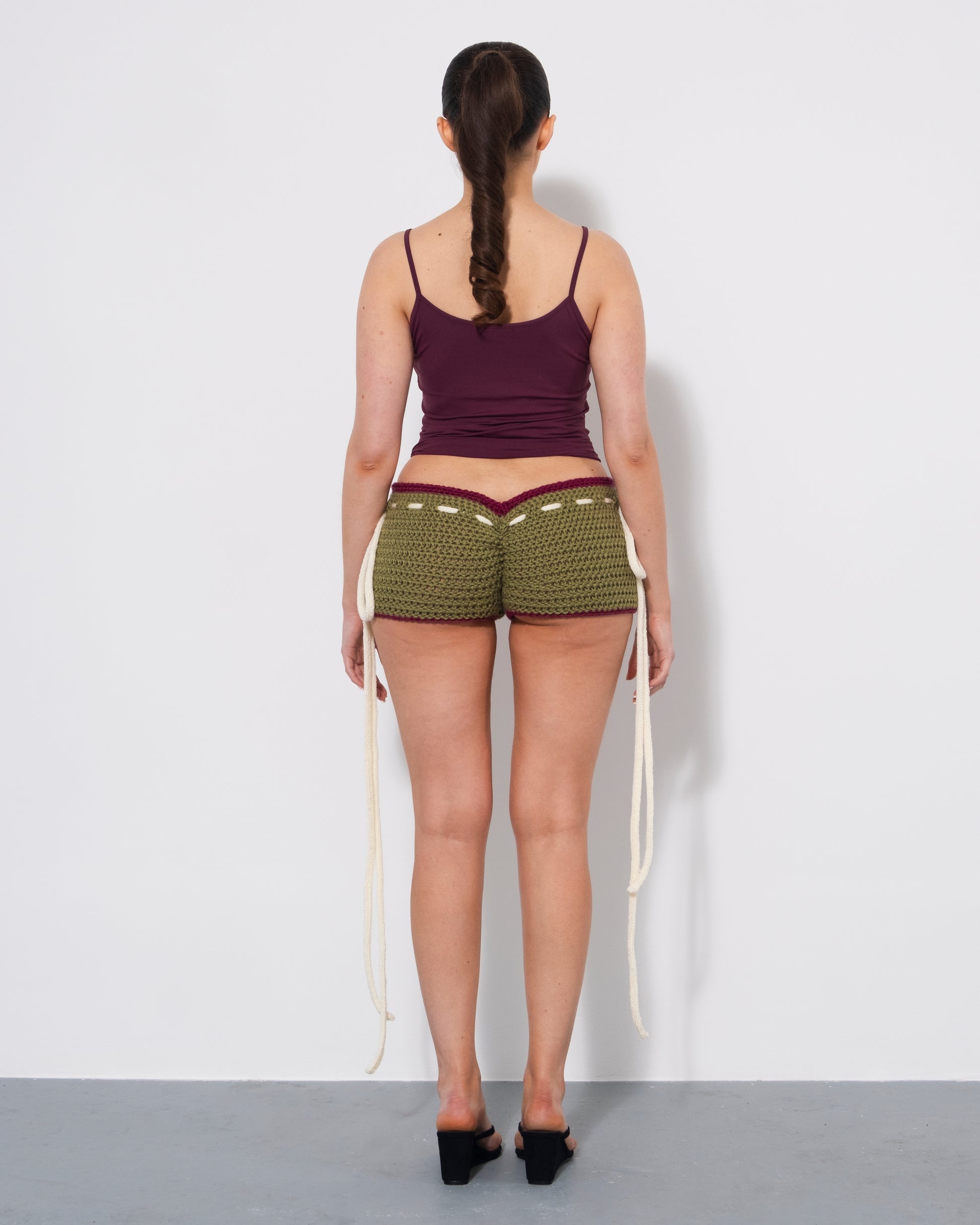Made from olive green and berry 100% wool, cream bows act as drawstring around the waist