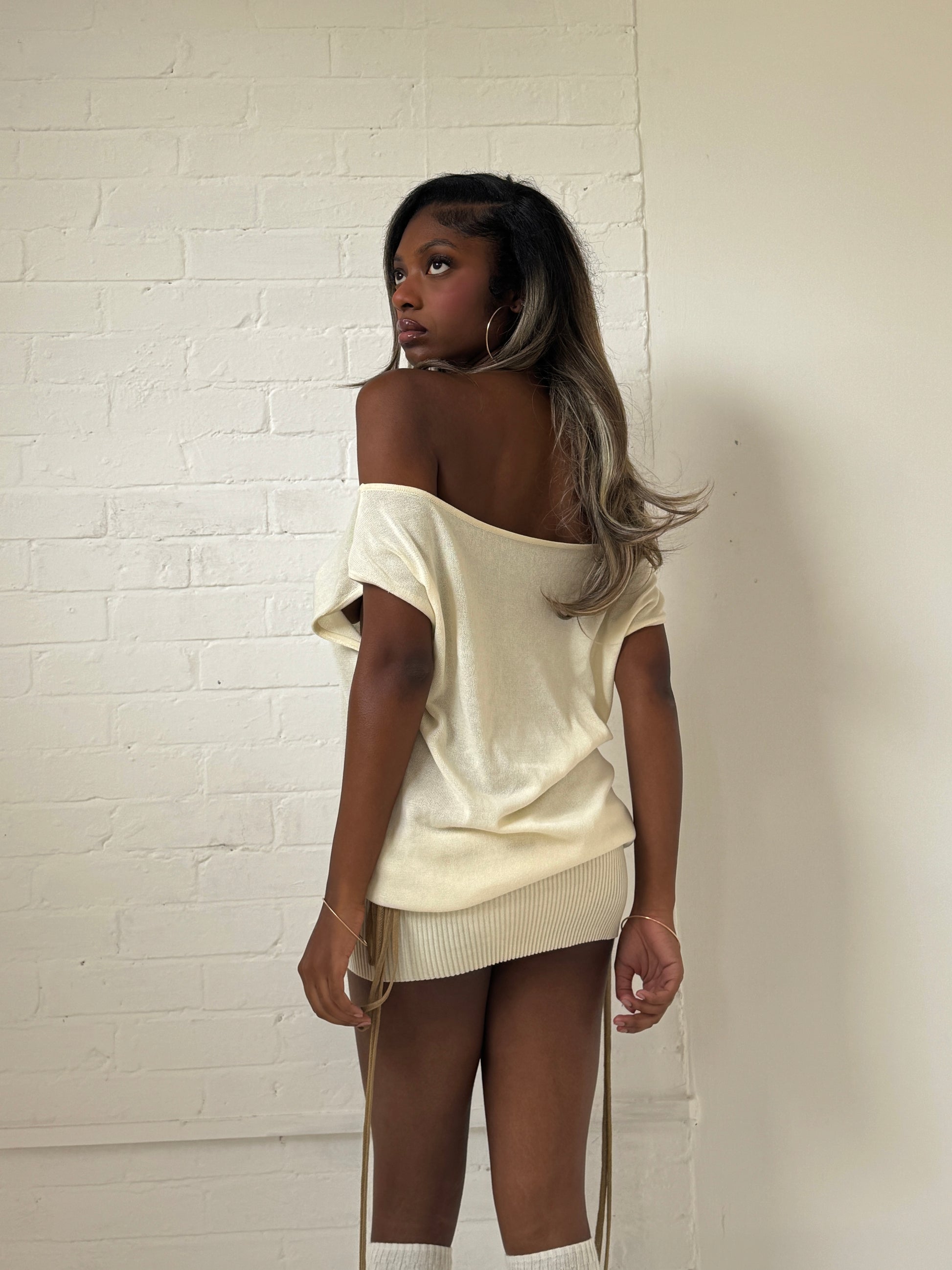 Cream slouchy off the shoulder knitted dress, constructed in a blend of ribbed and fine knit textures. Features adjustable bow-tie drawstrings at the hip for a flattering fit. Designed to move in.